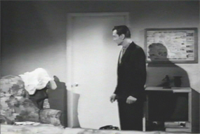 Later that afternoon, Ted pays that call on the Kings. Naturally, Lois prepares very carefully for this unexpected visit, taking a shower, and leaving her change of clothing out in the living-room; a living-room guarded by a door with a window.