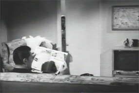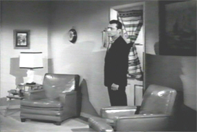 During his rather haphazard interrogation by Grant, Ted Baxter did reveal that he had a letter of introduction to Professor King and was on his way to his house (oh, okay, I guess that explains the suit). Hearing a knock on the door, King looks around in alarm, and orders the bewildered Lois – in a voice that I rather doubt wouldn’t be heard on the other side of what is a fairly flimsy front door, and which is, besides, only half-covered by a curtain – to tell anyone who asks that he has been in bed and asleep for the last hour.