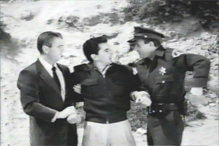The first person to stumble across the dead fisherman is not revealed to us. Instead we see only his loafers and his pants legs as he inspects the body. (This is shot like it’s a big mystery, although the person’s identity is revealed scant minutes later.) Only moments later, a second person happens onto the scene, causing the first person to take a powder. The newcomer, clad in suit and tie and dress shoes – perfect fifties beachwear – is bending over the body when a third person shouts, “Don’t touch that!”