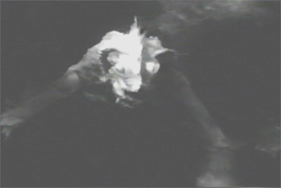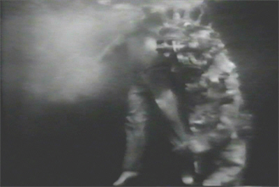 Conveniently enough, during that hour a tanker manages to wander across the beam of light – which is to say, it gets just as close to shore as our hard-working row-boat – and goes up in a fireball. This makes up King’s mind for him, and he prepares the deadliest of all possible retaliations: four sticks of dynamite and an alarm-clock. First, however, he does a decidedly half-assed rendition of the classic “trashing the lab” response, before admitting Andy the janitor and telling him that, “You may come in and clean up now.” Andy staggers back at the sight of King’s light-powered mutation, which he has also trashed. Bastard.