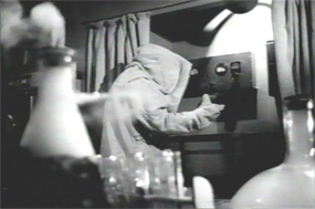 The entrance of King himself puts an end to the conversation. A painful amount of the film’s running-time is subsequently spent on the locking and unlocking of Professor King’s door, as well as on King’s peculiar dress rituals, wherein he enters, strips off his suit jacket, and puts on his lab coat – because he’s a SCIENTIST!! – before unlocking the door. Once inside, he re-locks the door, strips off his lab coat, and then puts on what in context I suppose is meant to be a radiation suit, but which looks more like one of those cloth coveralls that forensic investigators wear in some parts of the world.