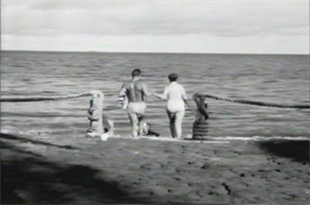 Meanwhile, the owner of the loafers has entered a beach house nearby, where he is scolded by a youngish woman for the whole coming-in-with-wet-shoes thing. Subsequent conversation reveals that these two are Professor King and his daughter, Lois. Naturally, King being a brilliant scientist, the laws of nature dictate that Lois must be as dim as this film’s photography.