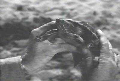 Meanwhile, during this oddly well-lit middle of the night, the elusive Professor King is sitting on the beach by the row-boat, gazing thoughtfully out to sea or jotting down notes. As he turns away he finds a turtle that just happens to be sitting right by the boat and scoops it up with a satisfied smirk that bodes very ill for the turtle.