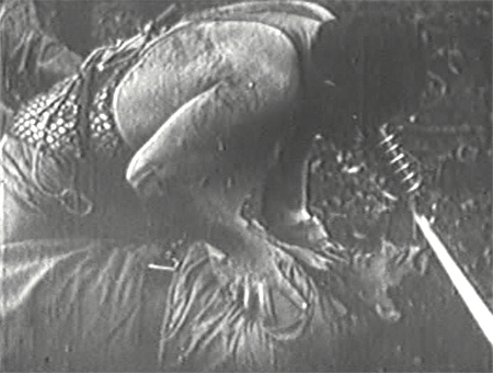Manyus is tied onto a flat altar-stone, above which is suspended a large flat rock with dagger-blades protruding from it. The natives set the mechanism in motion, and the deadly blades begin to descend—