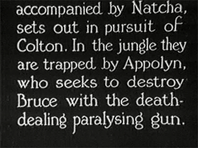 Butterfield sets out after Colton, Andrews sends the natives after Butterfield, Natcha and Bruce go after the natives—once Jerry has Two-Fistedly jumped Andrews, who tries to stop them—and we get one of those tedious everyone-following-everyone sequences. It ends up being Gorzo – or anyway, his giant – who recaptures Manyus; while Appolyn bails up Bruce and Natcha with the paralysing-ray, which he earlier used on a couple of Colton’s natives for no particular reason. He declares his intention of taking them back to the Lost City, and Bruce jumps him. They struggle on the ground while Natcha stands around waving her hands and screaming—as Appolyn discharges the paralysing-ray—