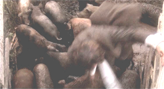 This is the set-up for Sugar Hill’s most fondly remembered scene—at least amongst those of us with a sick sense of humour. O’Brien, panicking too late, finds himself surrounded by zombies and led into the presence of Sugar, who looks thoughtfully down into a muddy pig-pen whose occupants, she assures O’Brien, haven’t had any garbage for nearly a week. And then she rectifies that situation: