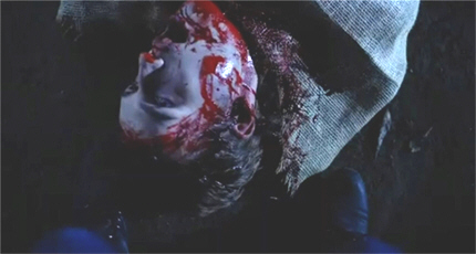 Hailey then heads for home, where everything seems dark and quiet—but she keeps her crossbow at the ready. She discovers her father dead on the stair landing, an axe wound in his head and bloody smears all the way down the wall. Her first thought is that Shae has done it – and in a sense, of course, she’s right – and after unleashing a scream of mingled rage and anguish, she presses on upstairs. There, she also finds her mother dead: not merely disembowelled but (in an impressive effect) almost exploded.