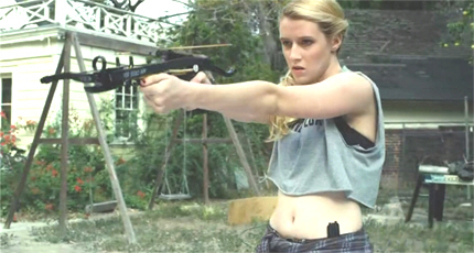 Transfixed with horror, Hailey does not at first notice that Shae is crouched in the corner of the room until she grabs her ankle and drags her to the floor, with an unintended shot from the crossbow going wide—leading Hailey to discover that while guns might be predictable, at least you don’t have to stop and reload them in between every shot while your hands are busy trying to keep an axe-wielding maniac at bay.