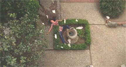 The house has other ideas, however: it fights Jenny’s attempt to place crystals around the room, rips away the large protective crystal she wears around her own neck so that it embeds itself in the ceiling, and finally tosses her through a window. Hailey, having herself been thrown out of the room with the door slammed in her face, rushes back in to find Jenny lying dead in the garden below, on her back and some distance from the house…